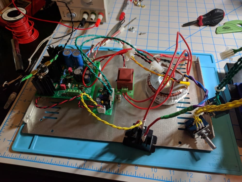 Then, the next step is to wire up the amplifier and the power supply. Now, the only know that the amplifier is getting power is from the LED mounted directly on the PCB.