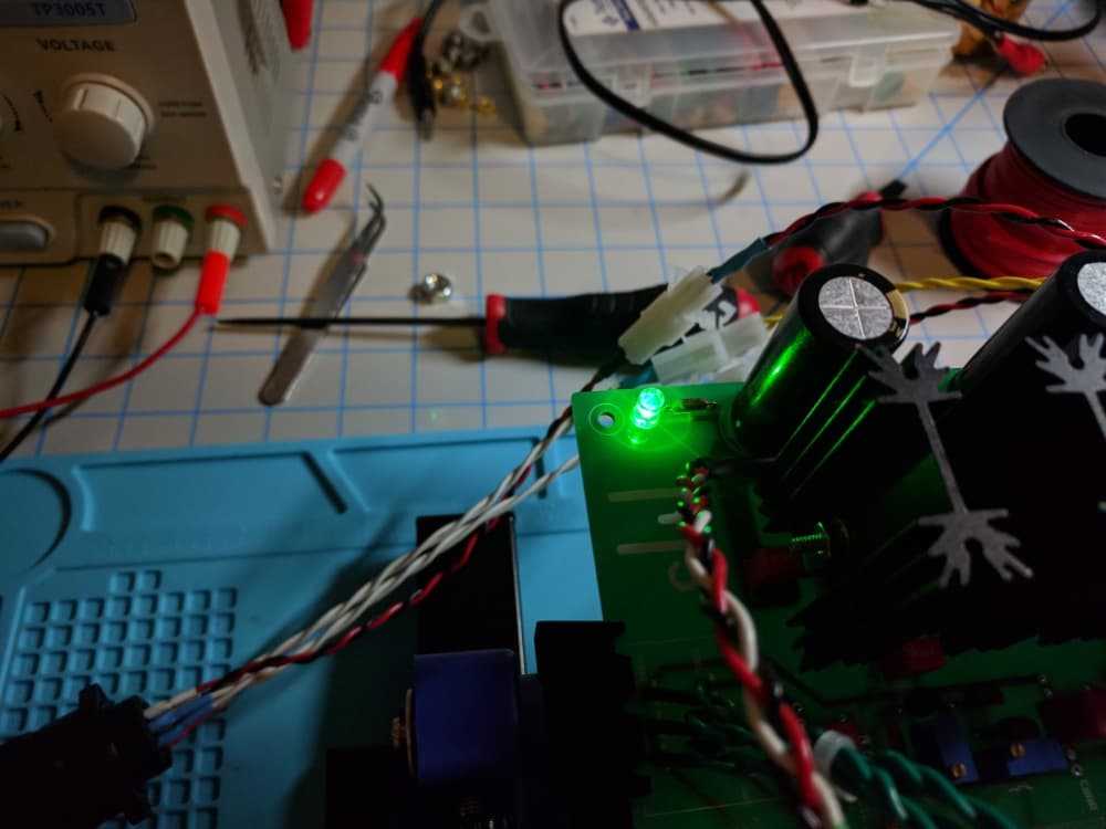 Then, the next step is to wire up the amplifier and the power supply. Now, the only know that the amplifier is getting power is from the LED mounted directly on the PCB.